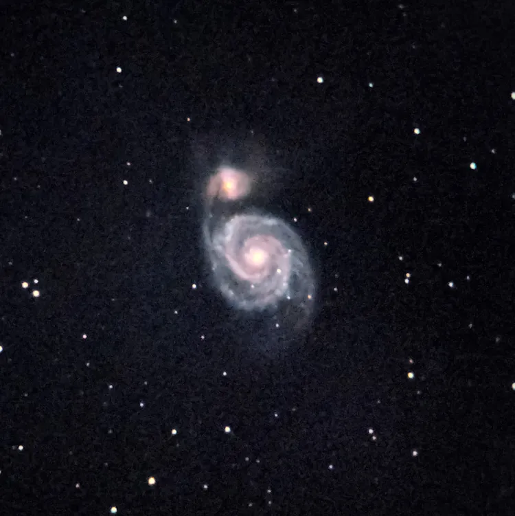 おおぐま座の尻尾の近くにある、明るくて特徴的な人気の銀河です。渦巻き銀河(親)に、小さな銀河(子ども)のNGC5195がくっついているように見えるので、子持ち銀河とも呼ばれます。