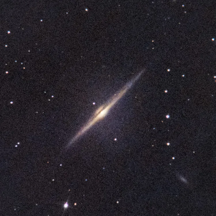 ニードル銀河(Needle Galaxy)という名前の通り、一本の針みたいな姿ですね。中心を横切っている暗黒帯も、よく見るとただの黒い線じゃなくて、なんだか細かな模様、複雑なモヤモヤがあるような様子が伝わってきます。